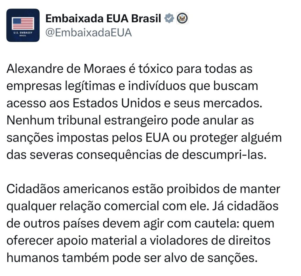 A posição, no entanto, foi duramente criticada pela representação diplomática americana em Brasília. Em publicação oficial, a Embaixada dos EUA afirmou que Alexandre de Moraes “é tóxico para empresas e indivíduos legítimos que buscam acesso aos Estados Unidos e seus mercados”, deixando claro que sanções impostas por Washington não dependem de homologação brasileira para serem cumpridas.