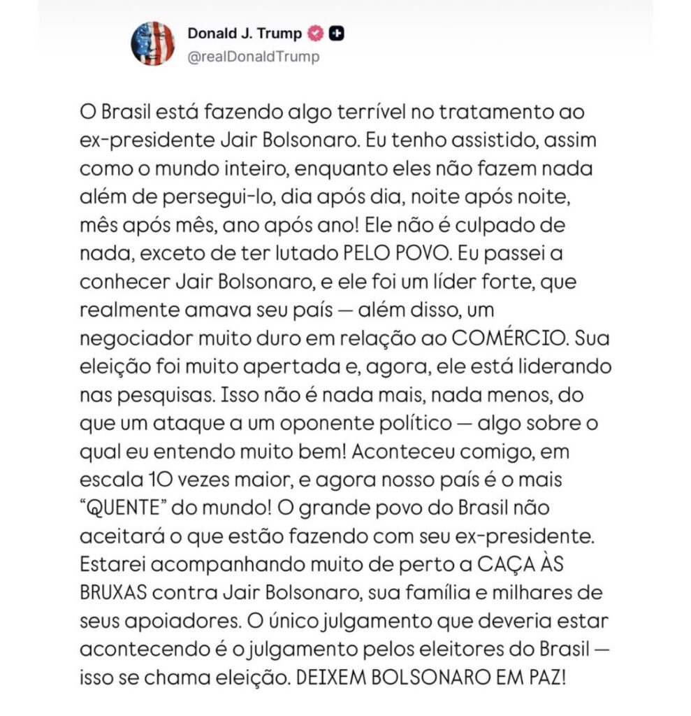 “Estarei acompanhando de perto essa verdadeira caça às bruxas contra Jair Bolsonaro, sua família e milhares de seus apoiadores. O único julgamento que deveria existir é o julgamento do povo brasileiro — isso se chama eleição. Deixem Bolsonaro em paz!”, escreveu Trump.