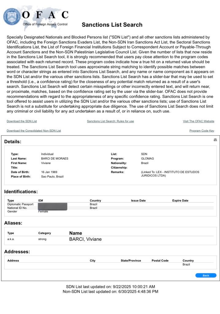 O governo dos Estados Unidos anunciou nesta segunda-feira (22.set.2025) que a esposa do ministro Alexandre de Moraes, Viviane Barci de Moraes, também foi incluída na lista da Lei Magnitsky Global, mecanismo usado contra estrangeiros acusados de corrupção ou violações de direitos humanos. A decisão foi publicada pelo Departamento do Tesouro norte-americano e aumenta ainda mais o isolamento do ministro e de sua família no cenário internacional.