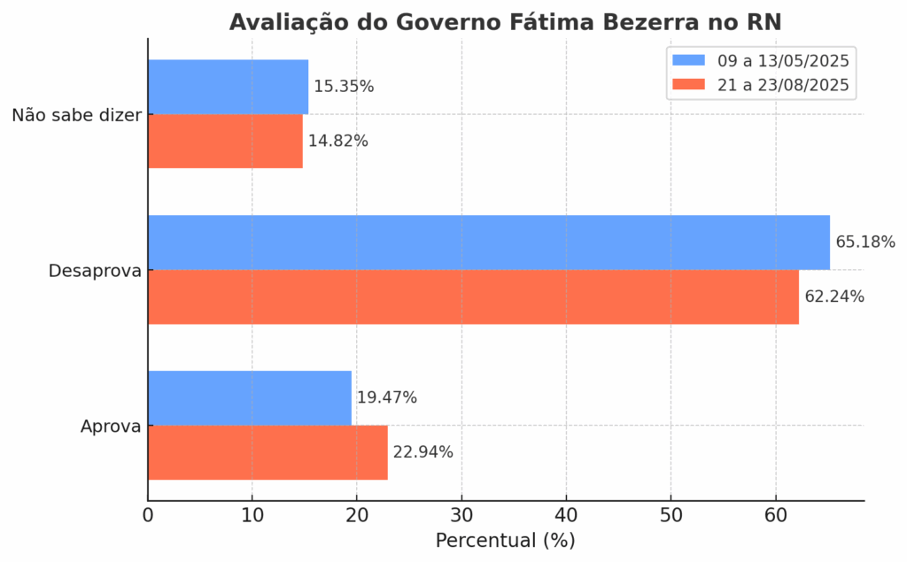 Mesmo com essa oscilação positiva, os números deixam claro que a rejeição ao PT continua predominante no Rio Grande do Norte. A desaprovação de Fátima e Lula segue maior que a aprovação, revelando um cenário de insatisfação que persiste apesar da presença de dois governos do mesmo partido no Estado e na Presidência.