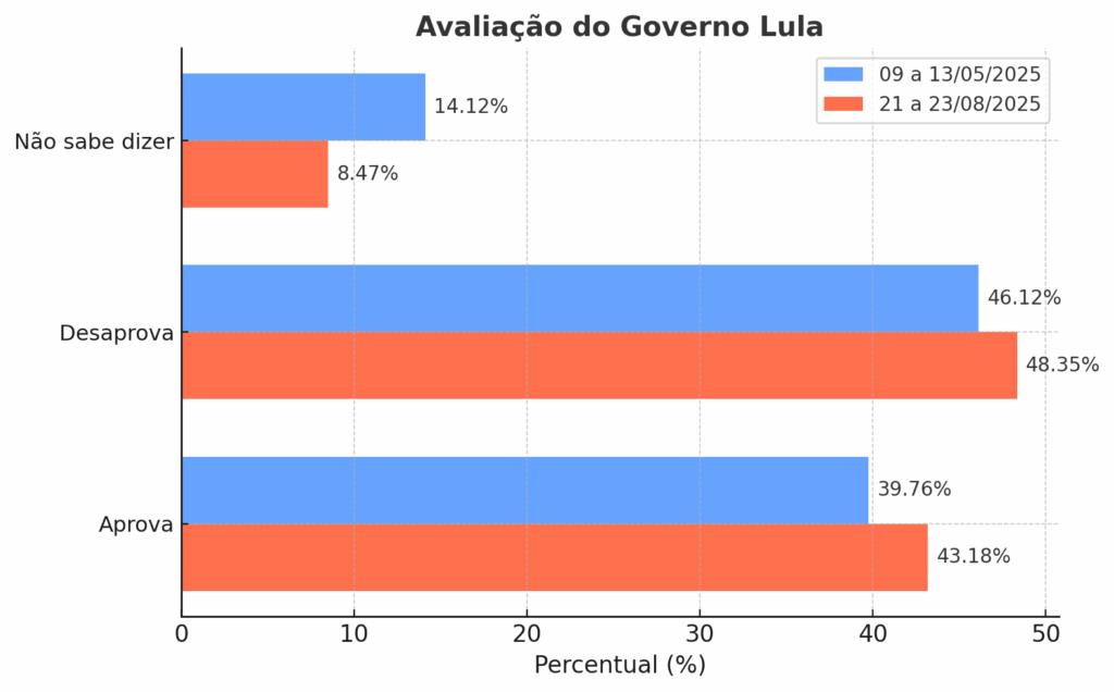 - Desaprovação: subiu de 46,12% (maio) para 48,35% (agosto)
