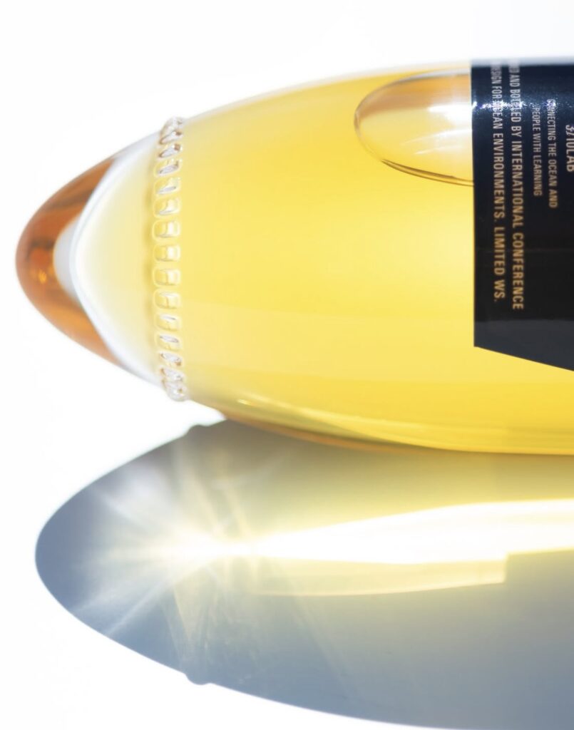 A garrafa faz parte de uma série de objetos com estética ligada ao oceano. Entre eles, uma calça jeans inspirada nas ondas do mar e uma régua com leve curvatura que remete à linha do horizonte.