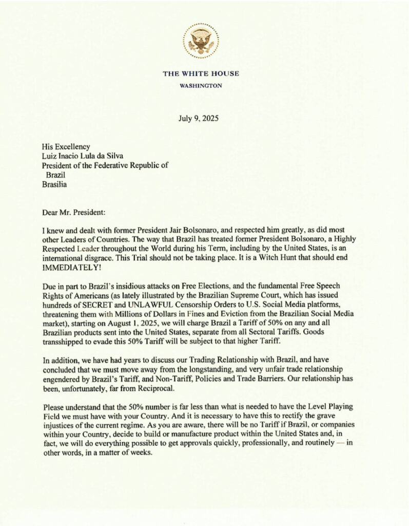 Se por qualquer motivo você decidir aumentar suas tarifas, então, qualquer valor que decidir aplicar será acrescentado aos 50% que já cobramos. Por favor, entenda que essas tarifas são necessárias para corrigir muitos anos de políticas tarifárias e não-tarifárias e barreiras comerciais do Brasil, que causaram déficits comerciais insustentáveis contra os Estados Unidos. Esse déficit é uma grande ameaça à nossa economia e, de fato, à nossa segurança nacional! Além disso, devido aos ataques contínuos do Brasil às atividades de comércio digital de empresas americanas, bem como outras práticas comerciais desleais, estou determinando que o Representante de Comércio dos Estados Unidos, Jamieson Greer, inicie imediatamente uma investigação da Seção 301 contra o Brasil.